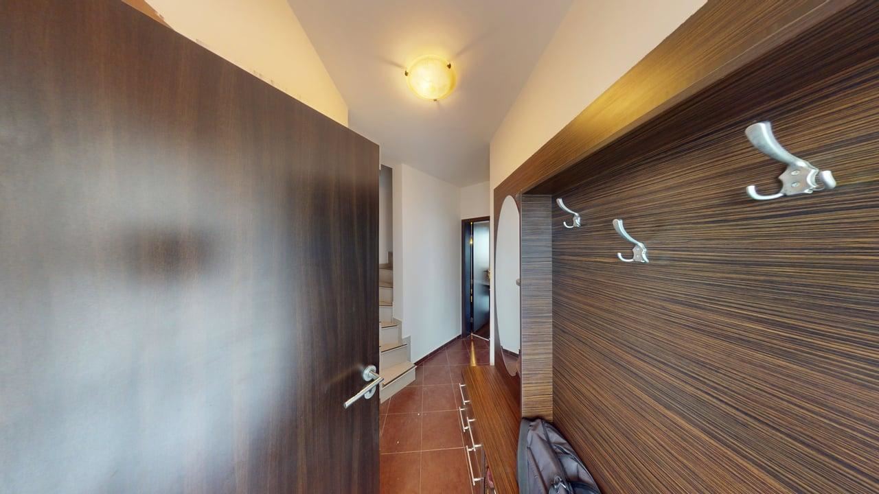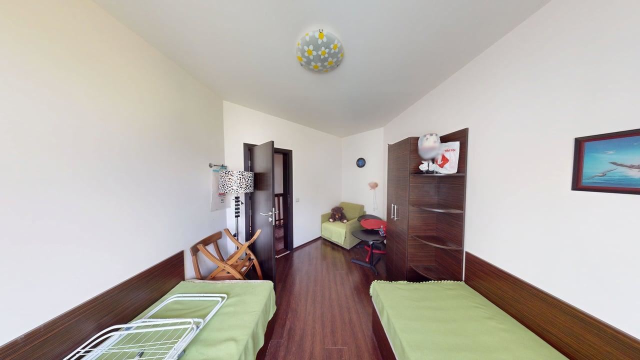 Eine elegante Treppe führt zur zweiten Ebene, wo zwei gemütliche Schlafzimmer Ruhe und Privatsphäre bieten. Ein separates Badezimmer sorgt zusätzlich für Funktionalität. Die Gesamtatmosphäre ist modern und harmonisch, mit Fokus auf Licht, Raum und Komfort. Dieses Reihenhaus ist ideal sowohl für ganzjähriges Wohnen als auch als Ferienhaus mit hervorragendem Mietpotenzial in einem der beliebtesten Ferienorte Bulgariens.
